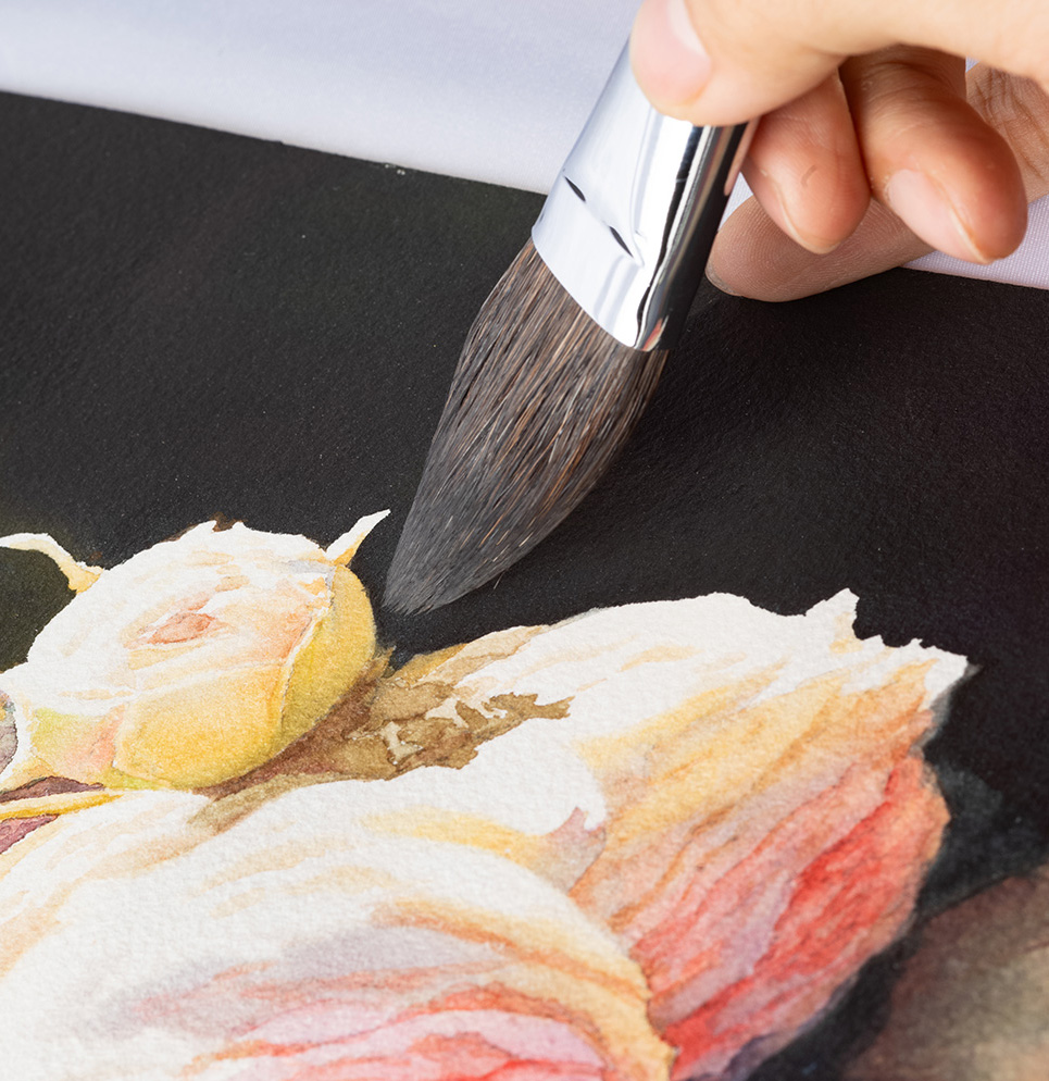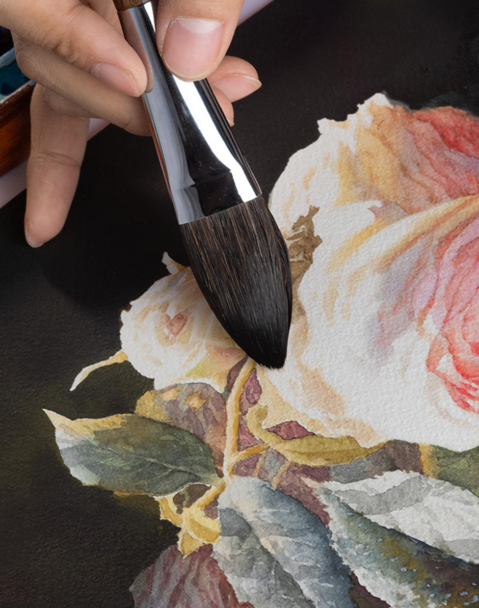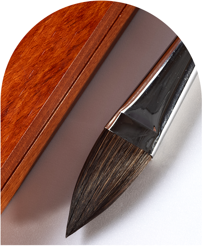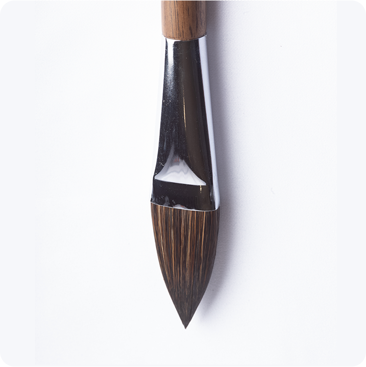 Made of squirrel hair with a gradient design—longer inner hairs and shorter outer hairs. Excellent water retention and even color pickup.