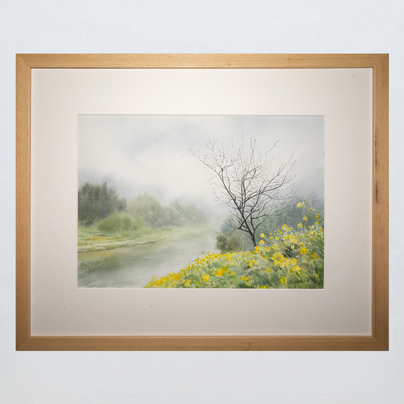This framed watercolor artwork presents a riverside scene shaped by moisture, distance, and softened light. The composition relies on pale atmospheric layering rather than strong contrast, allowing the river, the bare tree, and the flowering bank to unfold quietly across the scene.