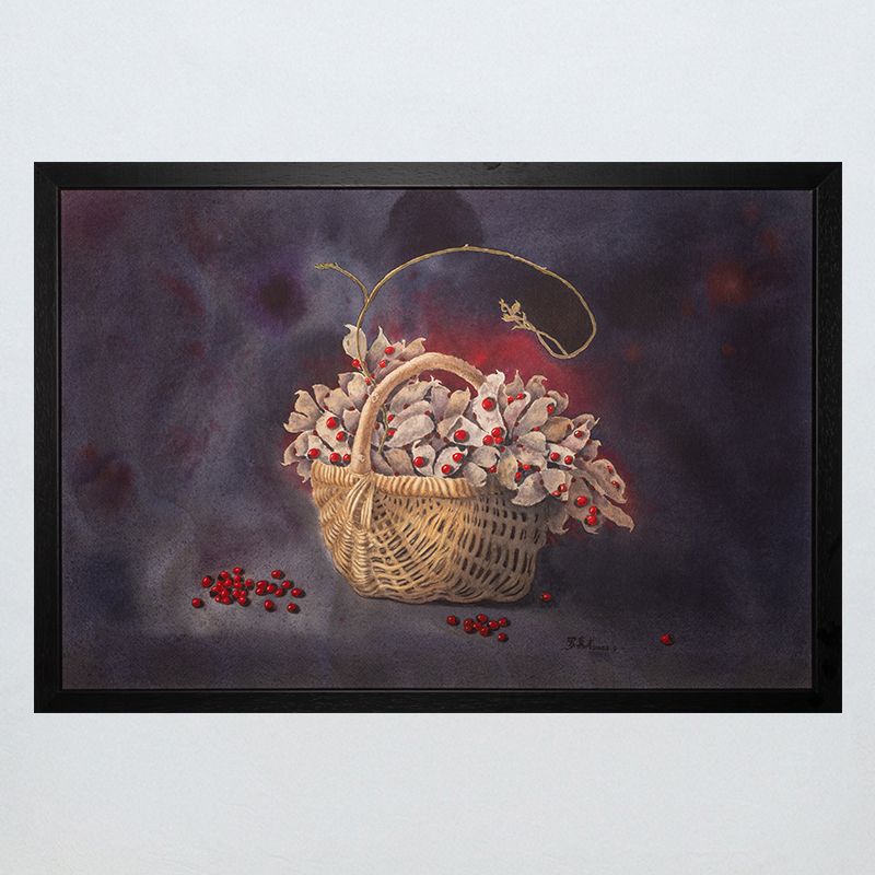 This framed watercolor artwork presents a carefully composed still life against a deep, moody background. The natural texture of the basket, the softness of the leaves, and the vivid red berries create a striking visual balance between delicacy and depth.