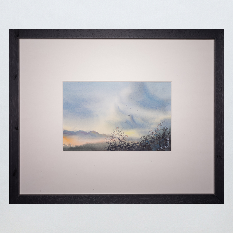 This framed watercolor artwork presents a quiet mountain-edge scene shaped by soft cloud, muted distance, and a lightly textured foreground of bare branches and low brush. The composition uses open sky and restrained color transitions to create a feeling of movement without urgency, allowing the landscape to unfold slowly and gently.